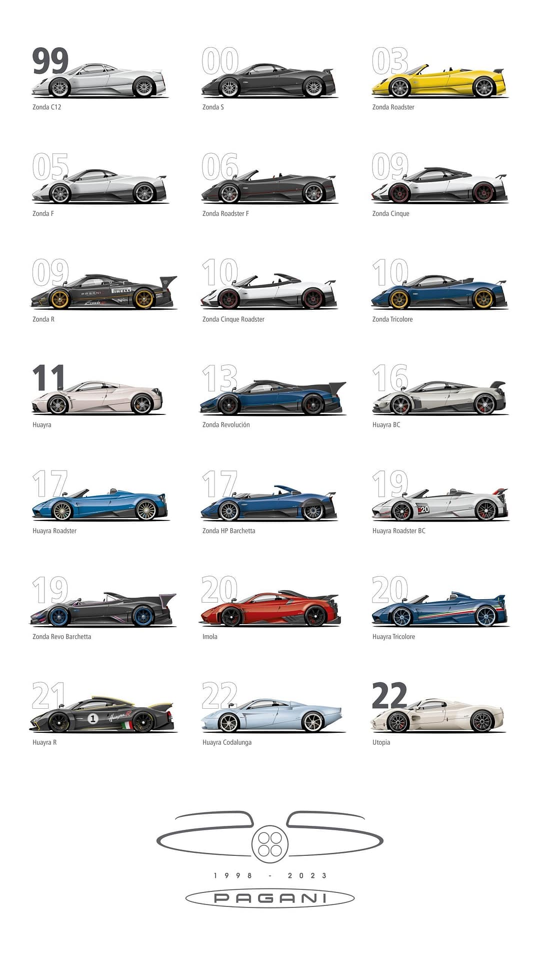 Ad abbracciarle ci saranno tutti i modelli che hanno segnato la storia del Brand: Zonda “La Nonna”, Zonda S, Zonda S Roadster, Zonda F, Zonda F Roadster, Zonda Cinque, Zonda R, Zonda Cinque Roadster, Zonda Tricolore, Zonda Revolucion, Zonda 760, Zonda HP Barchetta, Zonda Revo Barchetta, Huayra BC, Huayra Roadster, Roadster BC, Pagani Imola, Huayra Tricolore, Huayra R e Huayra Codalunga.
