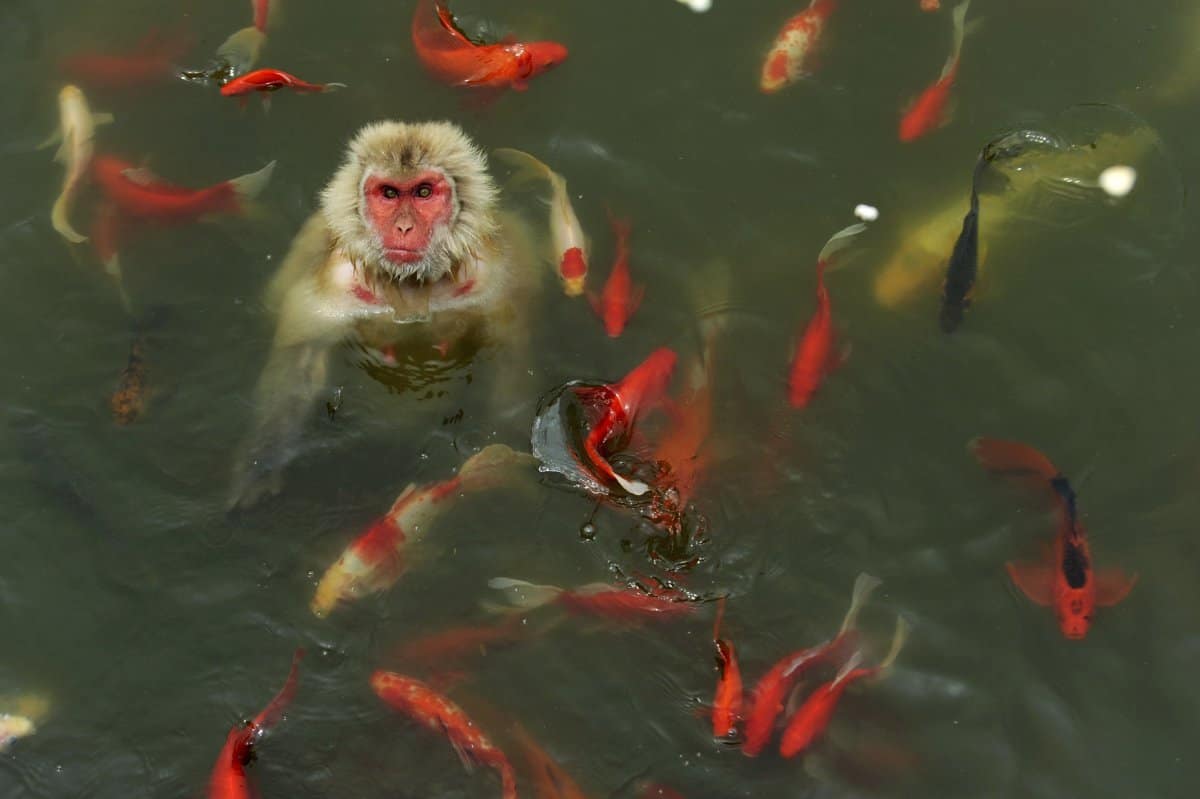 a-monkey-surrounded-by-carp-plays-in-a-pond-at-a-wildlife-park-in-china