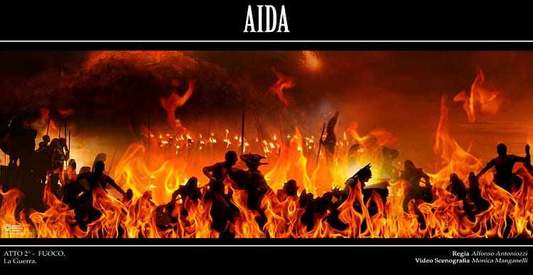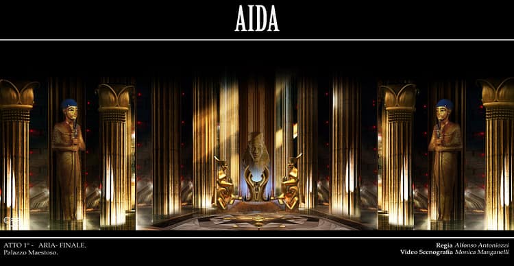 La direzione creativa dal punto di vista visivo-scenografico è realizzata da Monica Manganelli, scenografa per la lirica e vfx art director per il cinema. Per questa Aida, Manganelli ha ideato un immaginario egiziano futuristico e irreale, che richiama film di genere science-fiction, con l’intento di creare meraviglia visiva e stupore agli occhi dello spettatore. La scenografia virtuale in computer grafica diventa quindi protagonista insieme alla drammaturgia del libretto dell’opera di Verdi. L’animazione video segue infatti i tempi musicali e interagisce con le coreografie, creando atmosfere di volta in volta che raccontano la storia narrata dell’opera: effetti di animazione, tempeste di sabbia, giochi di fuoco che si sostituiranno ai tradizionali cambi scena. I 4 elementi, Aria, Fuoco, Acqua, Terra, caratterizzeranno simbolicamente ogni atto dal punto di vista visivo.