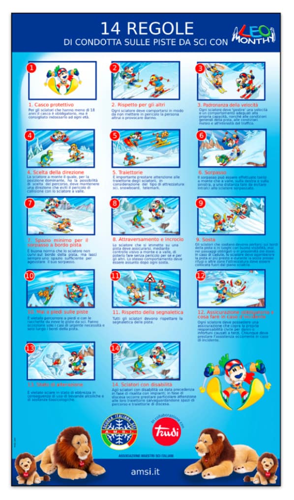 Divertimento responsabile. Grazie al lavoro dei Professionisti della neve associati ad AMSI e legati alla Scuola Italiana Sci, le nuove 14 Regole di condotta saranno illustrate anche durante le lezioni, singole o collettive, con esempi pratici che potranno aiutare gli sciatori di ogni età alla comprensione dell’importanza di
