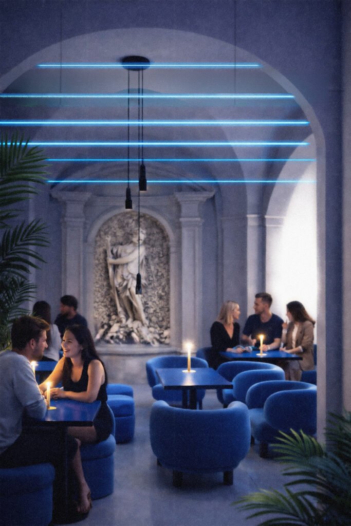 Un bar dalle molteplici ispirazioni ed evocazioni, tra archetipi e contemporaneità, che diventa un punto di riferimento della settimana: un luogo aperto, inclusivo, attraversato da musica e sperimentazione.