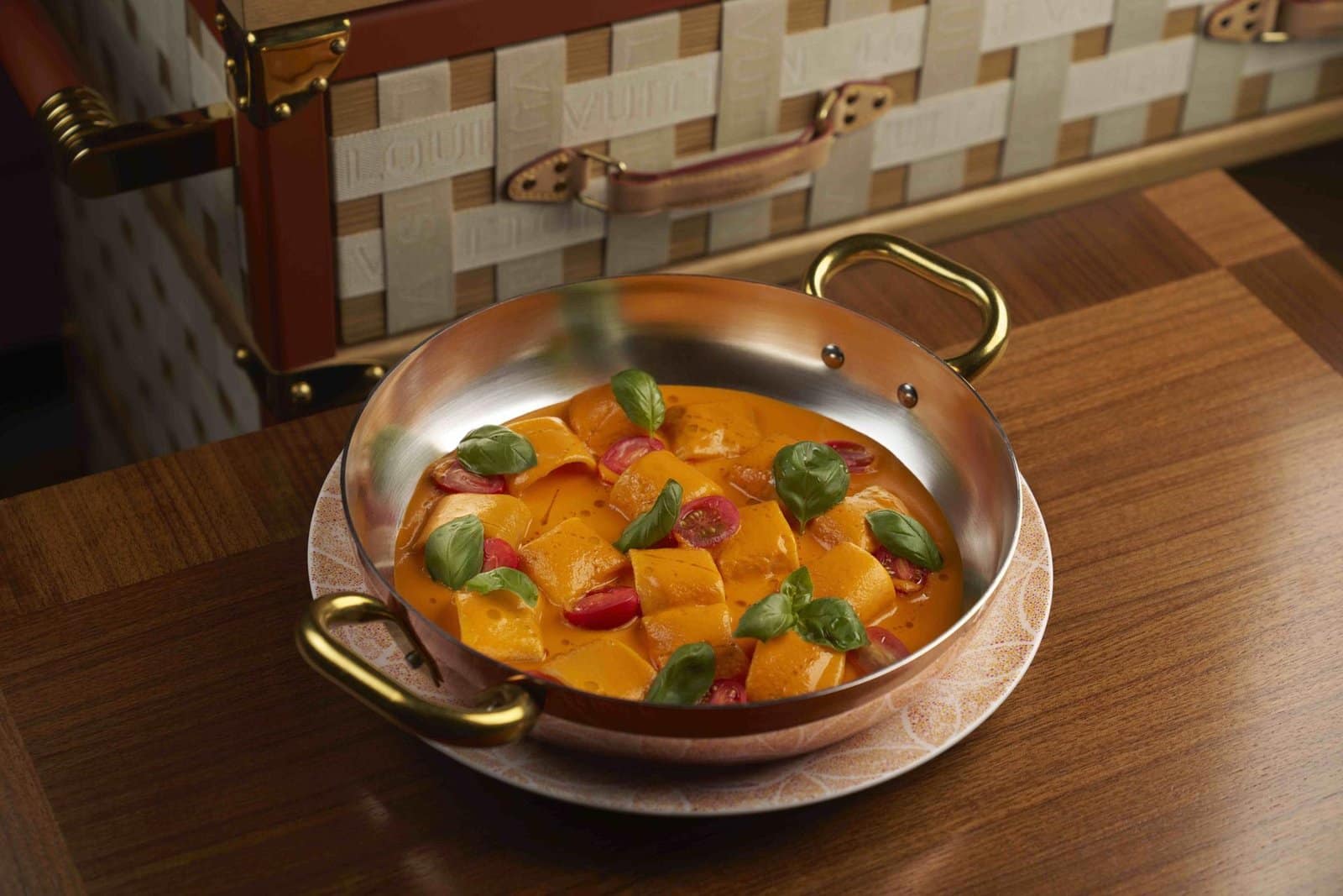 Gli antipasti vengono posti al centro, come nei tradizionali bacari veneziani. Si servono solo piatti italiani e non manca mai un riferimento giocoso all’immaginario Louis Vuitton. Uno dei piatti tipici della tradizione milanese, l’ossobuco accompagnato dal risotto allo zafferano, presenta il riso giallo sagomato a forma di fiore del Monogram di Louis Vuitton. Lo stesso approccio viene riservato ad alcune verdure e a certi frutti.