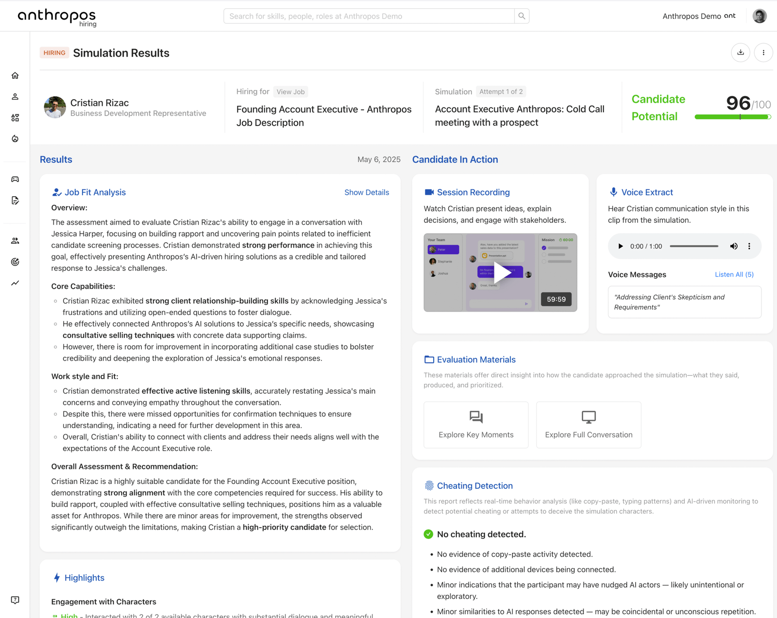 “Utilizzando Anthropos, le aziende riducono fino all’80% il tempo necessario per valutare un candidato, portando il processo da oltre 40 giorni a circa 10-15. Inoltre, aumentano il tasso di accuratezza nella selezione: i nostri assessments evitano che si crei bias sui candidati e permettono di avere una ulteriore conferma sulle scelte fatte o di orientarsi da subito sui candidati migliori e più motivati. Il sistema si integra con i principali ATS e permette anche la creazione di simulazioni custom da parte del team interno o con il supporto tecnico di Anthropos.”