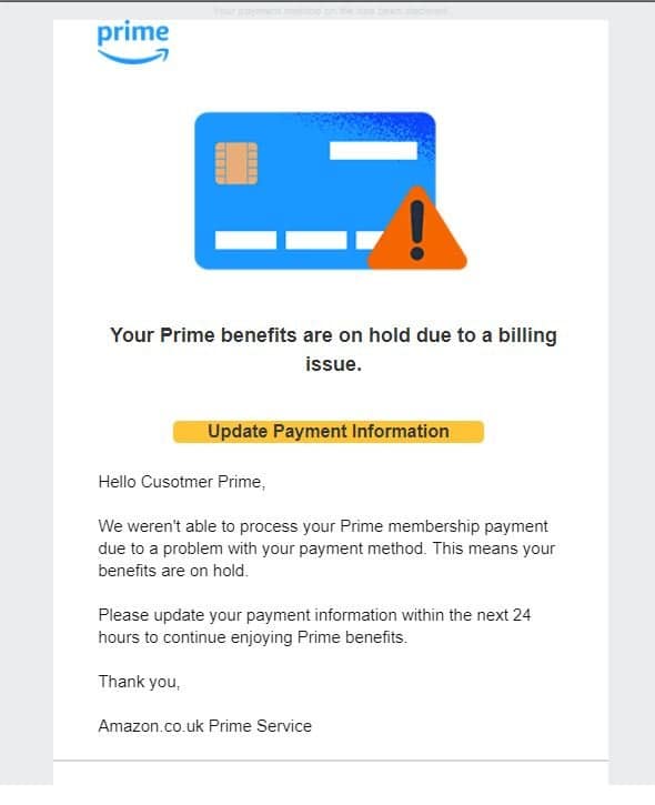 Oggetto: Il tuo abbonamento Prime: Pagamento rifiutato: Il metodo di pagamento è stato rifiutato, si prega di aggiornare il metodo di pagamento in modo che l’ordine non venga annullato e l’account non venga sospeso.