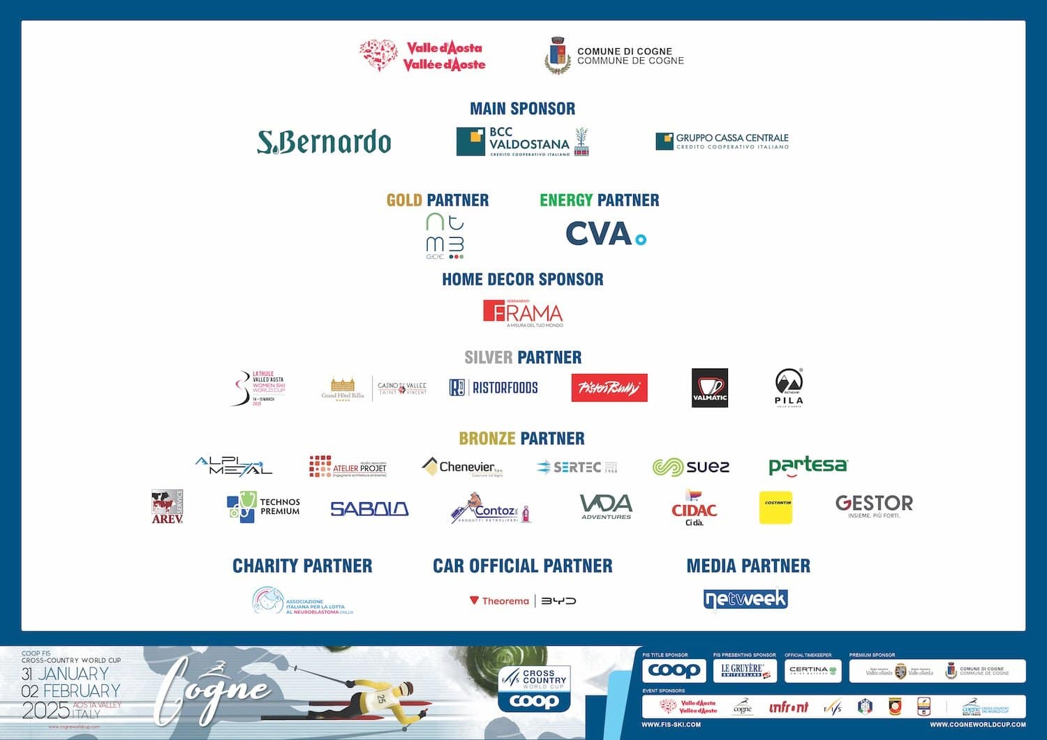 La Coppa del Mondo di Cogne è possibile grazie al sostegno della Regione Autonoma Valle d’Aosta, del Comune di Cogne e alla preziosa collaborazione della Federazione Italiana Sport Invernali e del Comitato Asiva, nonché ai tanti partner privati – a iniziare dai main sponsor Acqua S.Bernardo e BCC – che fin da subito hanno creduto nel progetto.