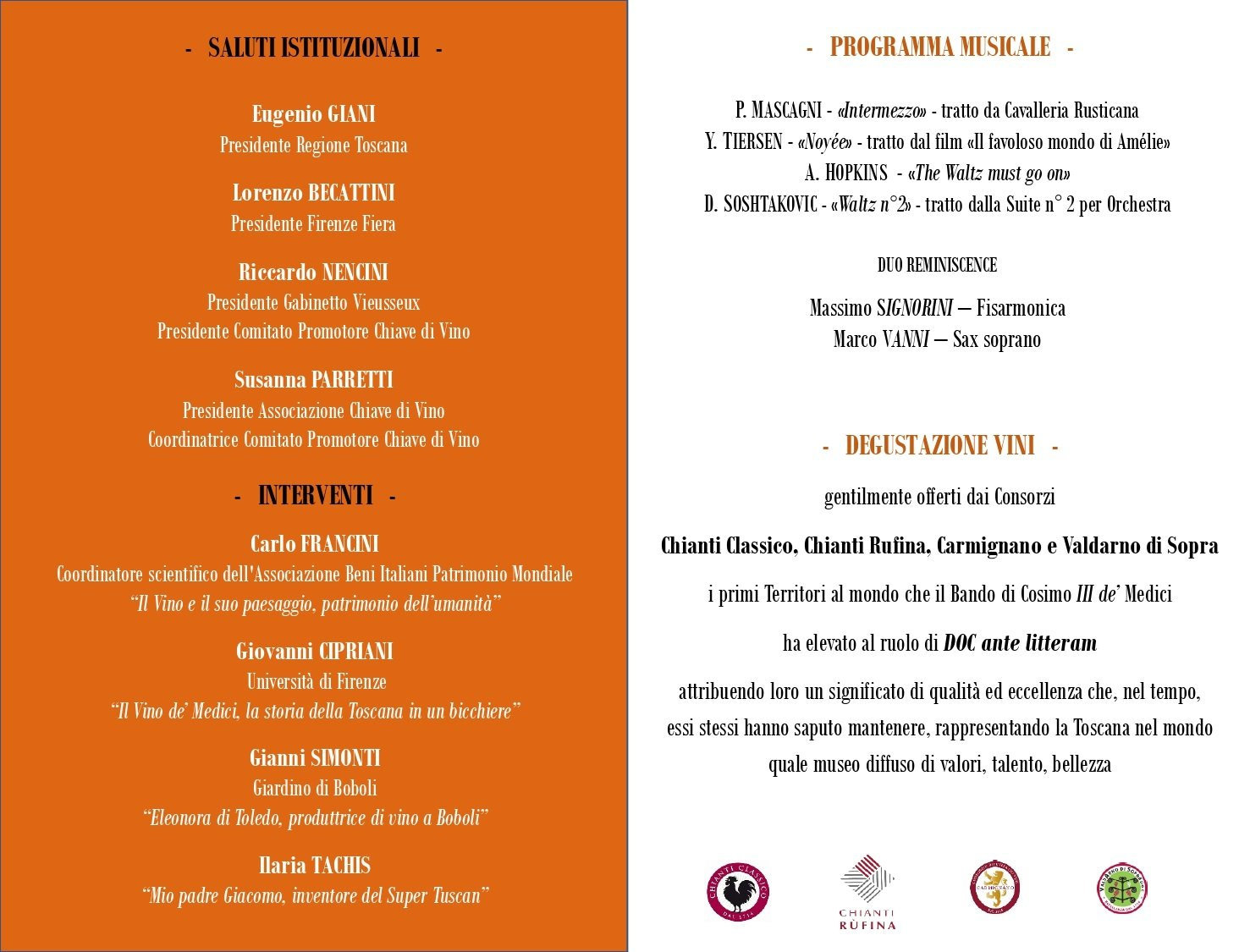 Per la degustazione finale, i vini sono stati offerti dai Consorzi del Chianti Classico, Chianti Rufina, Carmignano e Valdarno di Sopra, direttamente coinvolti in questa celebrazione in quanto rappresentanti di quelle 4 zone che il Bando di Cosimo III de’ Medici ha elevato, prime al mondo, al ruolo di DOC ante litteram.