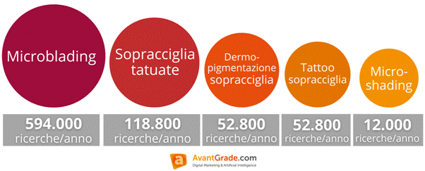 Dall’analisi di AvantGrade.com sui Google Trend, spiccano il microblading (594.000 ricerche all’anno) e le sopracciglia tatuate (118.800). Notevoli anche i volumi di ricerca su Google per la categoria riguardante il trucco permanente labbra (272.500 ricerche all’anno) e occhi (112.000 ricerche).
