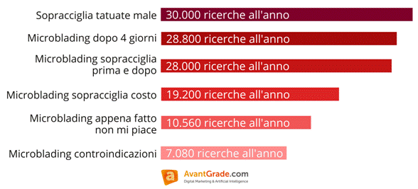 Le più frequenti riguardano “le sopracciglia tatuate male” (30.000 ricerche annue). A seguire: “microblading dopo 4 giorni” con 28.800 ricerche in un anno, e “microblanding sopracciglia prima e dopo” con 28.000 ricerche in un anno.