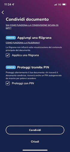 Inoltre, è possibile condividere un documento protetto con un Pin di sicurezza: il destinatario riceve tramite mail un codice autogenerato dall’app di quattro cifre, necessario per aprire il documento.