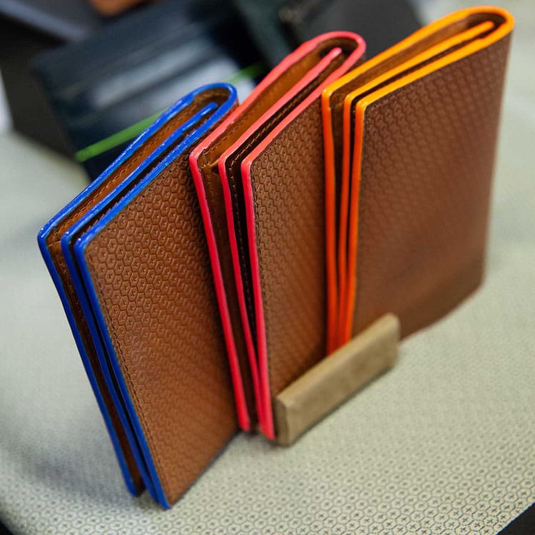 Portafoglio classico, portafoglio con cerniera a L, portafoglio a borsetta con zip, portachiavi, portadocumenti, portamonete, porta carte di credito, cinture, cinturini per orologi, cover per smartphone e braccialetti esclusivi realizzati con tecniche sartoriali.