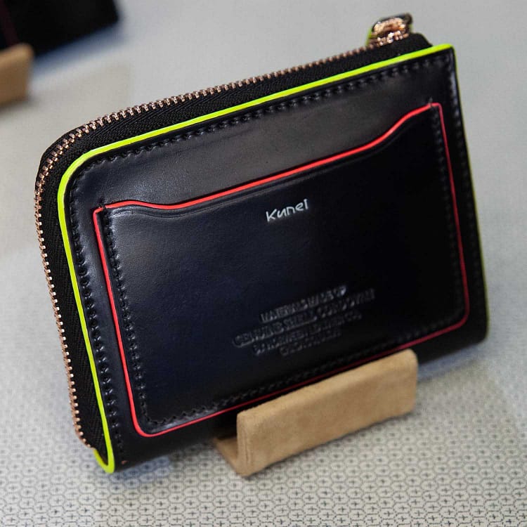 KUNEI realizza accessori luxury in pelle, realizzati abbinando la pelle “Horween Genuine Shell Cordovan” _ nota come il diamante della pellami _ con le fodere in pura seta “OmeshiOri”, il tessuto artigianale tradizionale di Kiryu, la famosa “città della seta” dove si producono questi tessuti comunemente usati per confezionare raffinati ed eleganti kimono o per decorare gli interni.