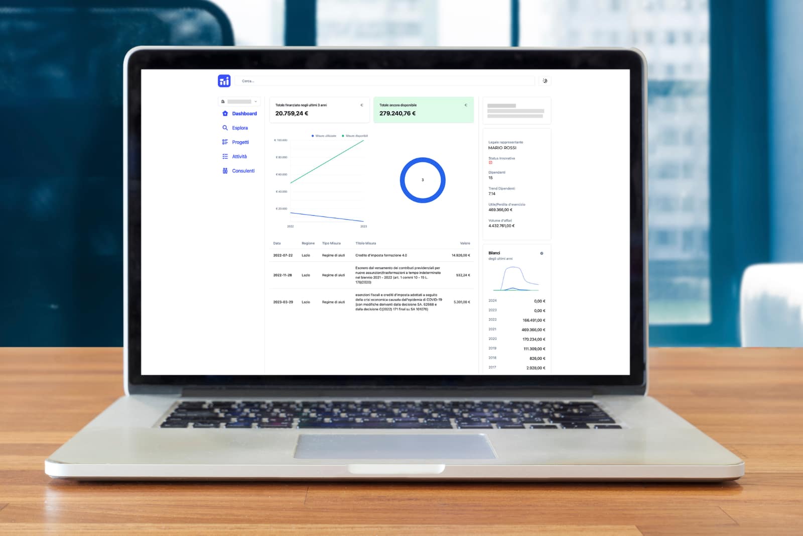 Le funzionalità della piattaforma MiFi sono numerose e tutte studiate per offrire un servizio completo e di semplice fruizione. Tanto per cominciare è possibile visualizzare i dati della propria azienda, compresi quelli storici inerenti le agevolazioni già ottenute, all’interno di un unico ambiente: una dashboard intuitiva e personalizzabile.
