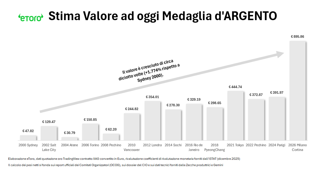 L’ultima analisi della piattaforma di trading e investimento eToro, redatta da Gabriel Debach, market analyst di eToro, si concentra sul valore delle medaglie dei Giochi Olimpici Invernali Milano Cortina 2026, che entrano nella storia non solo per il loro valore sportivo e simbolico ma anche per quello economico.