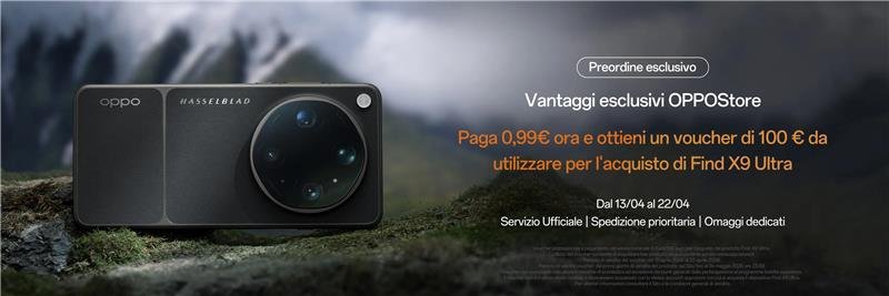 1 Voucher promozionale a pagamento del valore nominale di euro 100 euro per l’acquisto del prodotto Find X Ultra, esclusivamente sul sito oppostore.it. Periodo di vendita del voucher: dal 13 aprile 2026 al 22 aprile 2026. Periodo di validità voucher: dal primo giorno ufficiale di vendita del prodotto sul Sito fino al 24 maggio 2026 ore 23:59. Voucher non cumulabile con ulteriori iniziative di scontistica ad eccezione dei punti generati dalla partecipazione al programma fedeltà oppostore. Il voucher non è in alcun modo cedibile e deve essere acquistato con lo stesso account oppostore con cui si acquista il dispositivo Find X9 Ultra. Per ulteriori informazioni consultare il Sito e le condizioni generali di vendita.