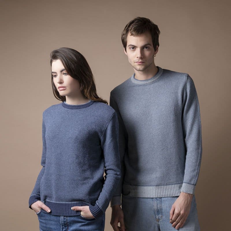 Tutti i filati sono realizzati attraverso un processo di rigenerazione che parte dalla raccolta e selezione di vecchi indumenti, i quali vengono sfilacciati, trasformati di nuovo in materia prima, filati e poi tessuti in nuovi capi durevoli e di qualità.