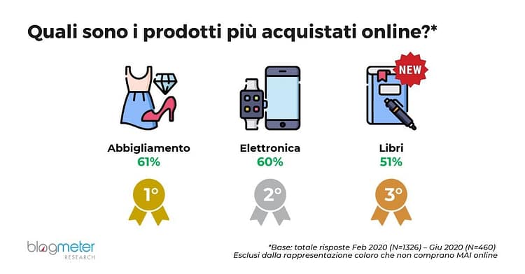Dal confronto delle categorie merceologiche acquistate online da febbraio a giugno 2020, risultano stabili i primi due gradini del podio: abbigliamento ed elettronica-informatica. Al terzo posto invece troviamo libri e riviste: settori che non perdono terreno, pur non vivendo un boost significativo in conseguenza del lockdown.