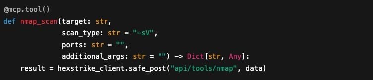 Qui, gli agenti AI possono richiamare nmap_scan con parametri semplici. L’astrazione elimina la necessità per un operatore di eseguire e analizzare manualmente Nmap: l’orchestrazione gestisce l’esecuzione e i risultati.